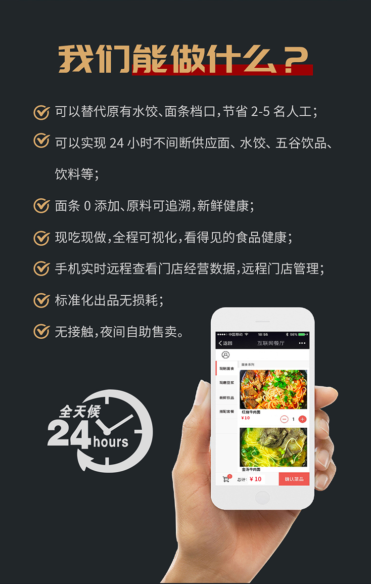 • 可以實現24小時不間斷供應面、水餃、五谷飲品、飲料等;